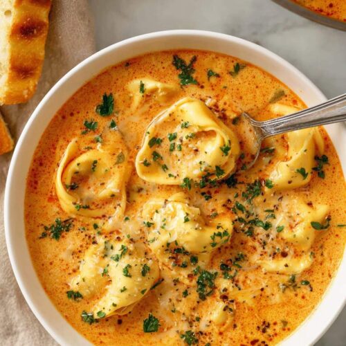 Here is my favorite tomato tortellini soup recipe, with tender cheese-filled pasta, rich tomato broth, and a blend of herbs and spices that makes it perfect for any weeknight dinner.