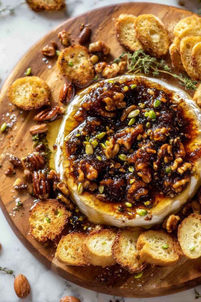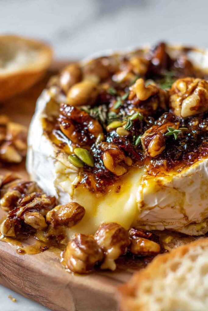 - Remove the brie from the oven and immediately drizzle honey over the hot, melted cheese. Serve right away with toasted bread, bagel crisps, and fresh fruit on the side for dipping. For an extra touch, I like to let guests drizzle a bit more honey or add extra nuts at the table.