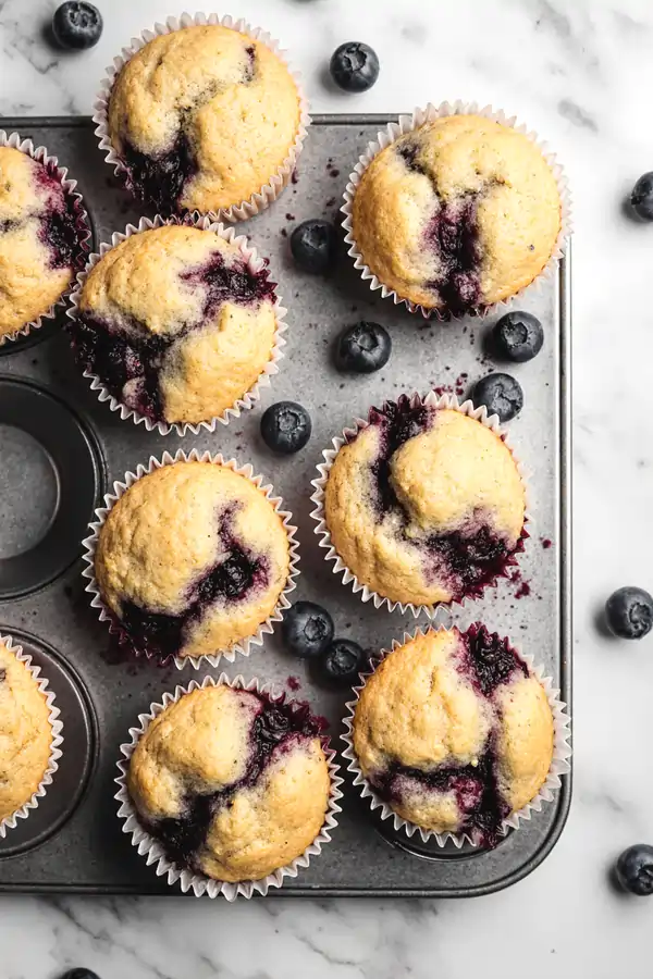 To prevent your blueberries from sinking to the bottom of the muffins, toss them in a little flour before folding them into the batter, and don’t forget to check for doneness with a toothpick around the 18-minute mark since protein muffins tend to bake faster than regular ones.