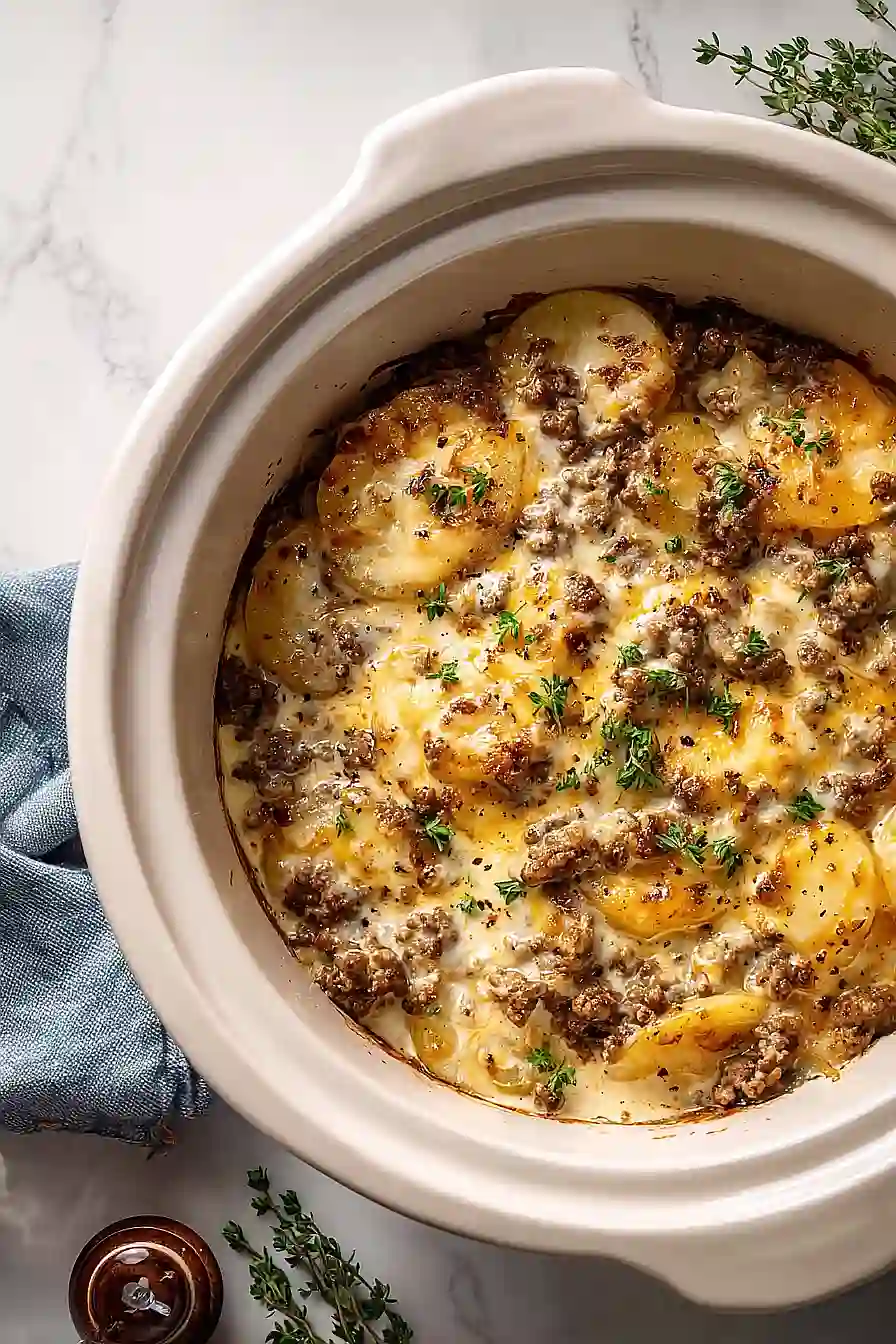 - Once the potatoes are tender, remove the lid and let the dish rest for a few minutes so the cheese on top can fully melt and set slightly. Stir gently to combine all the layers, breaking up any large potato pieces if needed, then serve directly from the slow cooker or transfer to a serving dish. The creamy potato, beef, and cheese mixture should be cohesive and comforting.