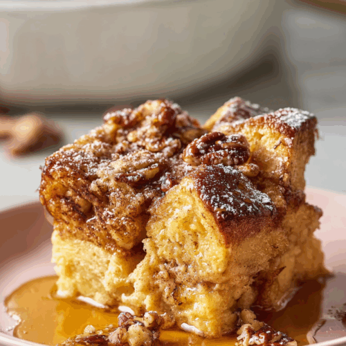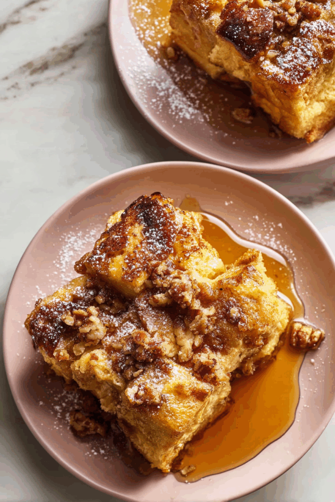 - Let the baked casserole cool for 5 minutes before serving. Serve slices with a drizzle of warm maple syrup or a dusting of powdered sugar, and optionally, fresh berries on the side. For extra indulgence, I love to serve mine with a generous pour of maple syrup — it really brings out the flavors!