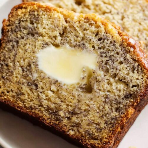 Freeze: This banana bread freezes like a dream for up to 3 months. Wrap the whole loaf or individual slices in plastic wrap, then pop them in a freezer bag. It’s so nice having homemade banana bread ready to go in the freezer for busy mornings or unexpected guests.