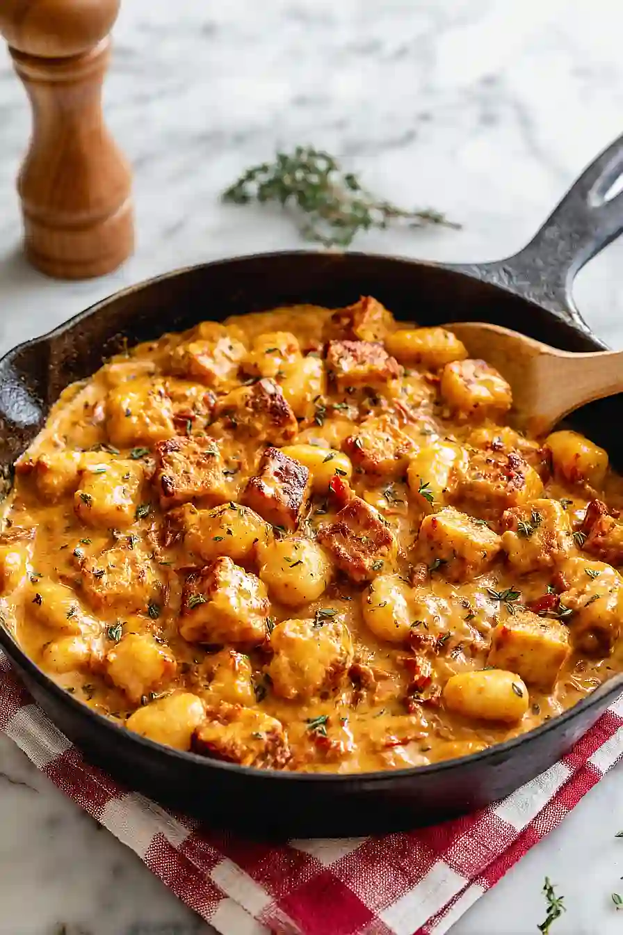 • Rich, creamy sauce – The garlicky, tomato-infused sauce with sun-dried tomatoes and vegan cheese coats every piece of gnocchi and tofu, making each bite incredibly flavorful.