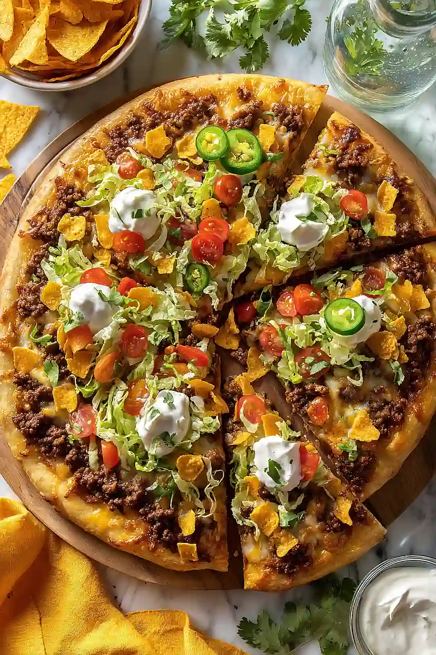 - Remove the pizza from the oven and let it cool for 1-2 minutes before slicing. Serve with your choice of fresh taco toppings like shredded lettuce, diced tomatoes, crushed tortilla chips, sour cream, jalapeños, or any other garnishes you prefer. The beauty of taco pizza is that diners can customize their slices with whatever toppings they like.