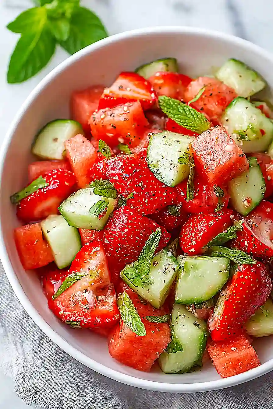 - Fresh, seasonal ingredients – The combination of sweet strawberries, juicy watermelon, and crisp cucumber creates a light and refreshing dish that screams summer.