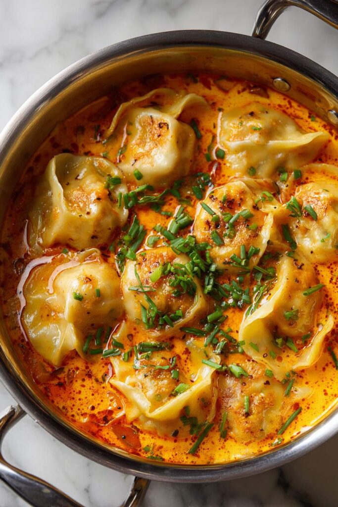 - Ladle the hot soup and dumplings into bowls. Garnish each serving with chili oil, sliced scallion greens, chopped fresh cilantro, and a sprinkle of crunchy garlic for extra flavor and texture.