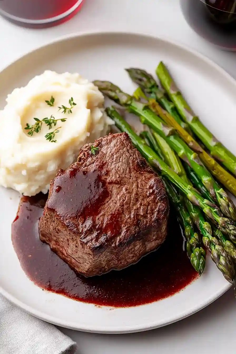 Since filet mignon is such a special cut of beef, I love pairing it with classic steakhouse sides that really complement that rich red wine sauce. Creamy mashed potatoes or roasted fingerling potatoes are perfect for soaking up all that delicious sauce, while roasted asparagus or green beans add a nice fresh contrast to the richness of the steak. A simple arugula salad with lemon vinaigrette helps cut through the butter and wine flavors, and don’t forget some crusty bread to make sure you get every drop of that sauce. For a truly indulgent meal, sautéed mushrooms or caramelized onions make excellent additions alongside your steak.