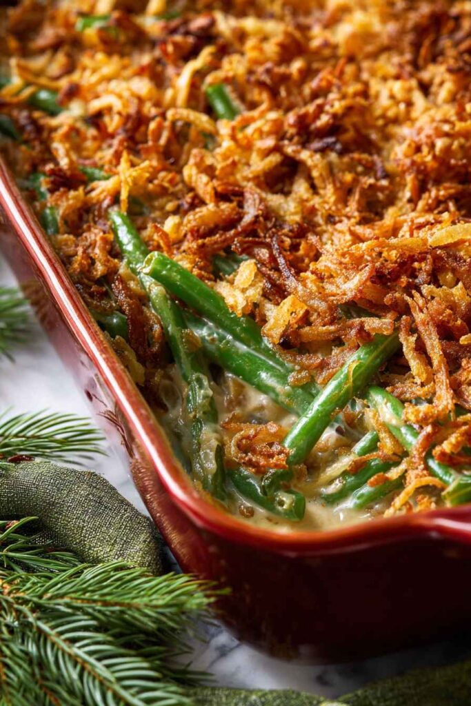 Make Ahead: You can assemble this casserole up to 2 days before serving – just hold off on adding the crispy onion strings until right before baking. Cover it well and keep it in the fridge, then add about 10 extra minutes to the baking time since it’ll be cold from the fridge.