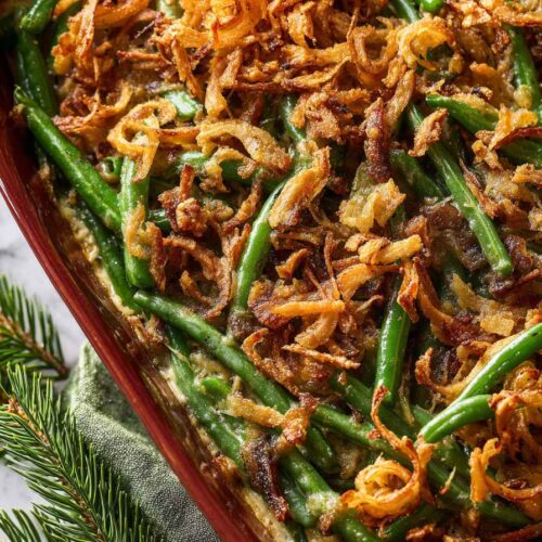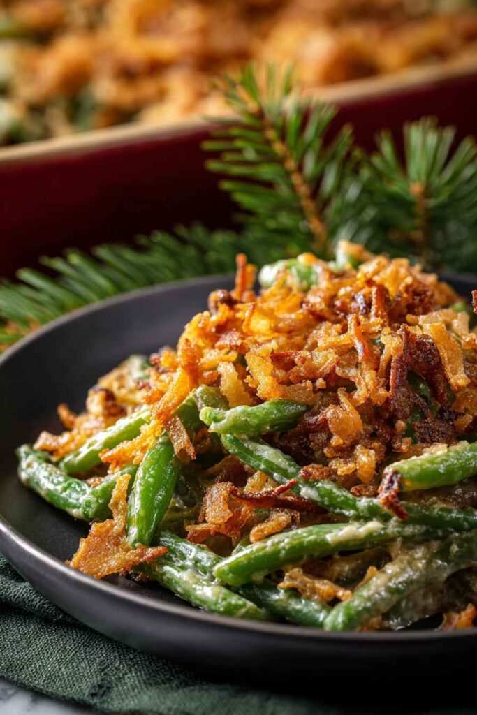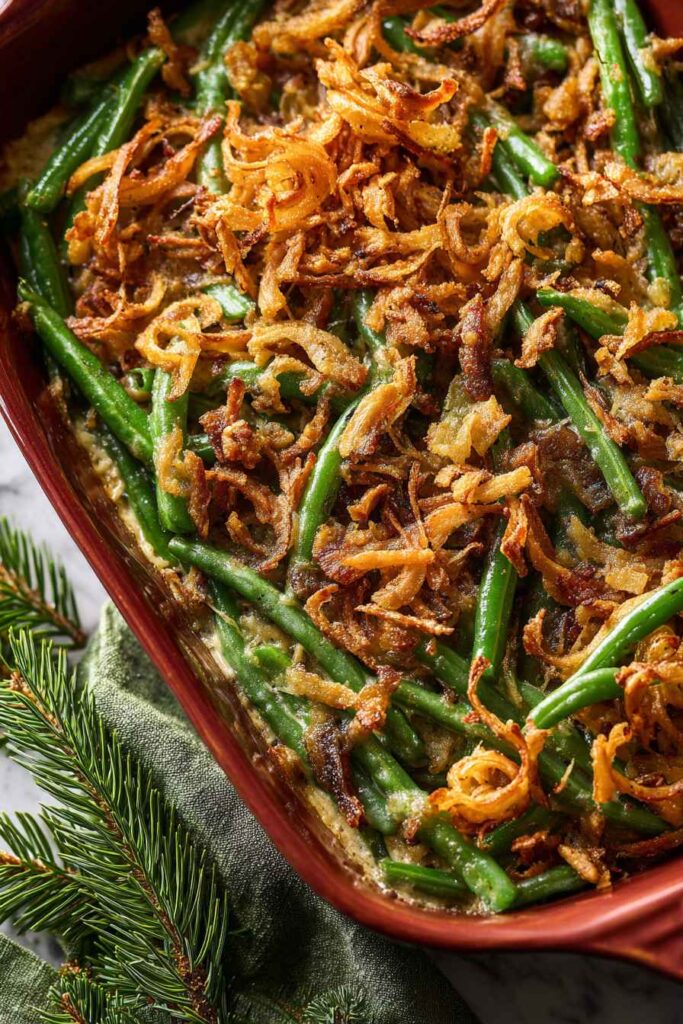 Green bean casserole is a total crowd-pleaser that pairs beautifully with just about any main dish you can think of. It’s practically made for holiday dinners alongside roasted turkey, glazed ham, or even a simple roasted chicken for weeknight meals. The creamy, savory flavors also work great with grilled pork chops or beef roast if you’re looking to switch things up. Since this casserole is already pretty rich and satisfying, I like to round out the meal with lighter sides like cranberry sauce, dinner rolls, or a fresh mixed greens salad to balance everything out.