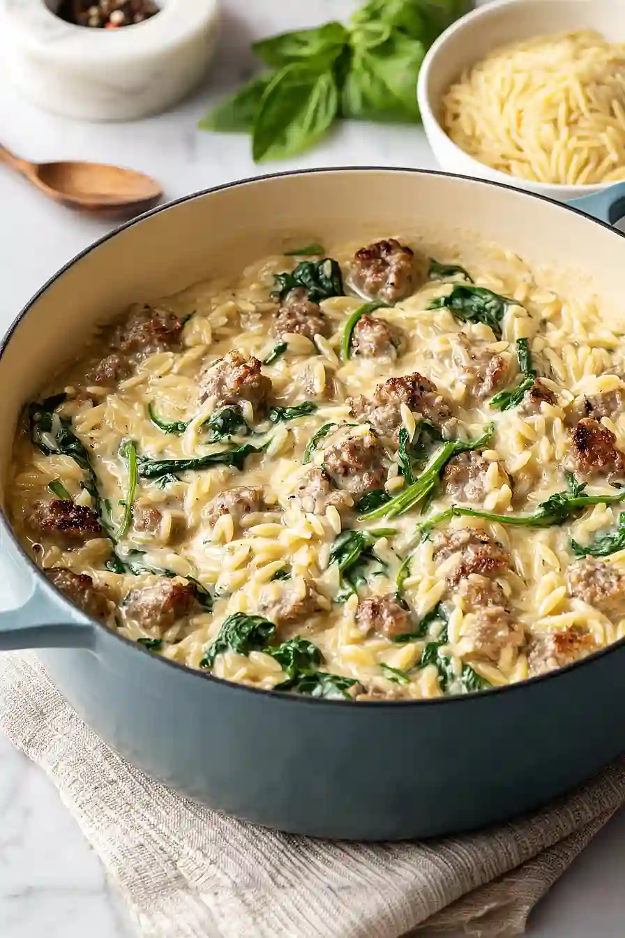 - Cover the pot and let it rest for 3-5 minutes off the heat. This allows the flavors to meld together and the orzo to achieve its final tender texture. Just before serving, taste the dish and season with salt to your preference—the sausage, broth, and Parmesan are already quite savory, so you likely won't need much. Give it a final gentle stir and serve immediately while hot and creamy.
