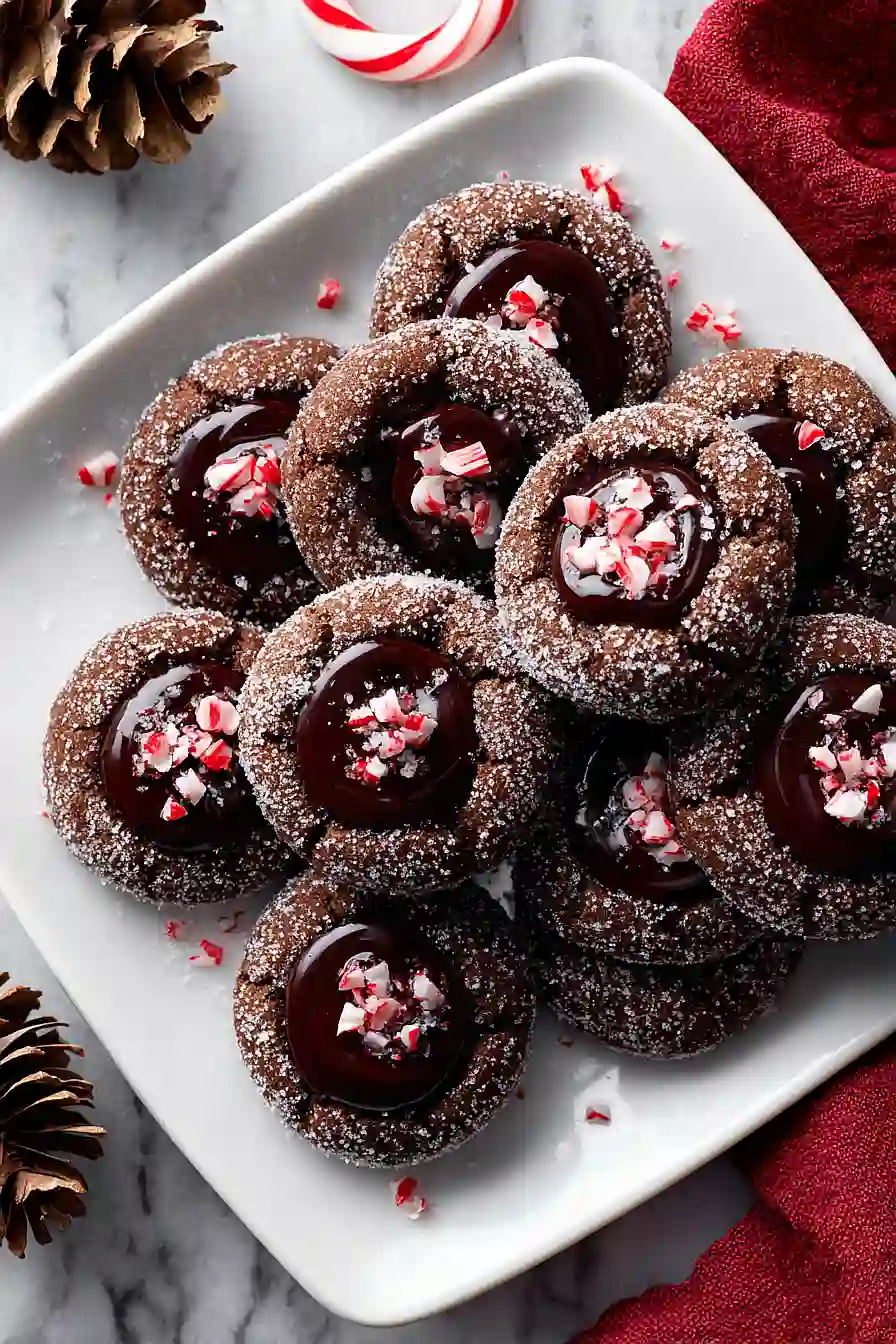 Here are my peppermint bark thumbprint cookies, with a rich chocolate cookie base, a smooth ganache filling, and crushed candy canes on top for that classic minty holiday flavor.