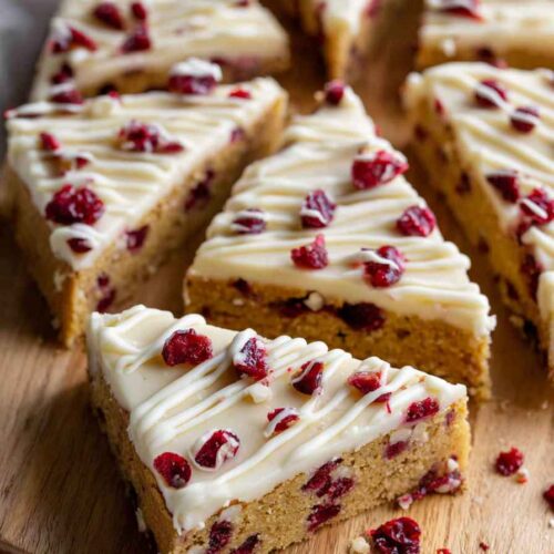 - Impressive presentation – With their creamy frosting, colorful cranberry pieces, and white chocolate drizzle, these bars look bakery-quality and are sure to wow your guests.