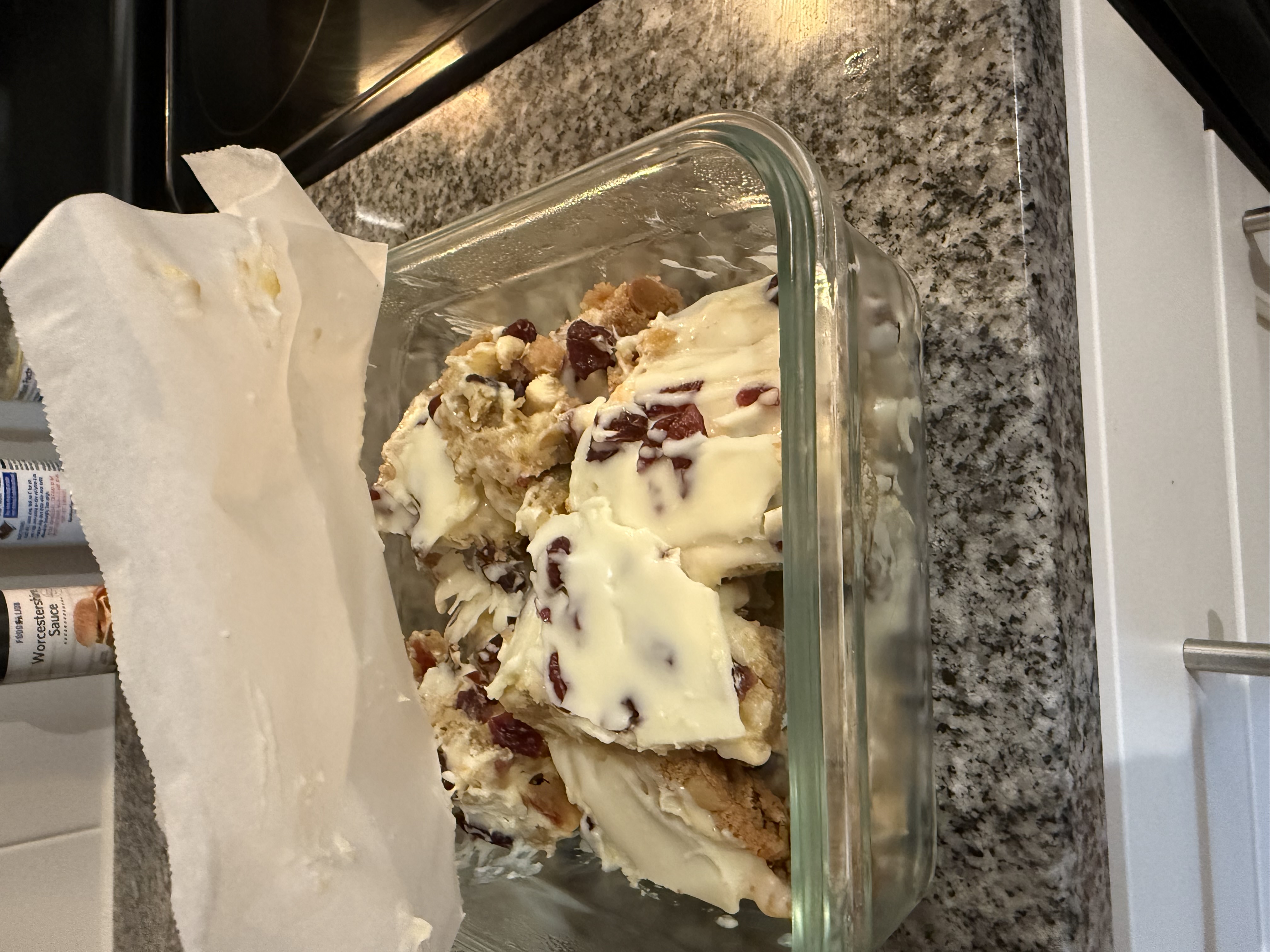Fold in the chopped or chipped white chocolate and dried cranberries.