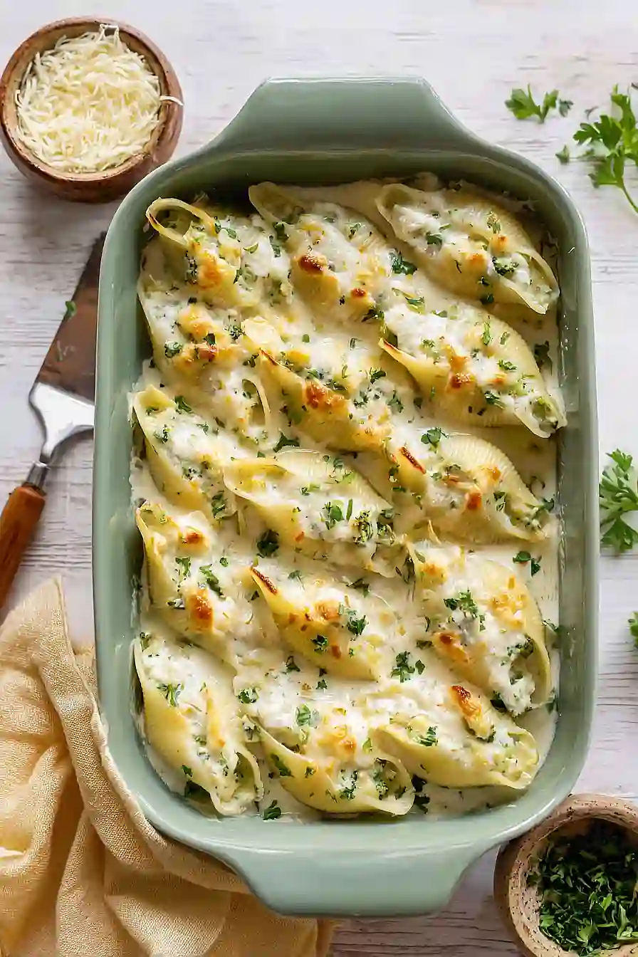 Since these stuffed shells are pretty rich and creamy, I like to balance them out with a crisp green salad tossed with a light vinaigrette – the acidity really cuts through all that cheese and cream. Garlic bread is always a crowd-pleaser on the side, perfect for soaking up any extra Alfredo sauce left on your plate. If you want to add more veggies to the meal, roasted asparagus or green beans with a squeeze of lemon work beautifully alongside the pasta. A simple Caesar salad is another great option that keeps with the Italian theme without making the meal feel too heavy.